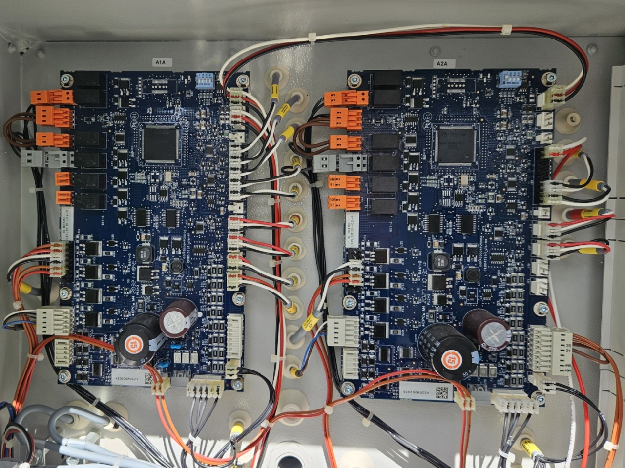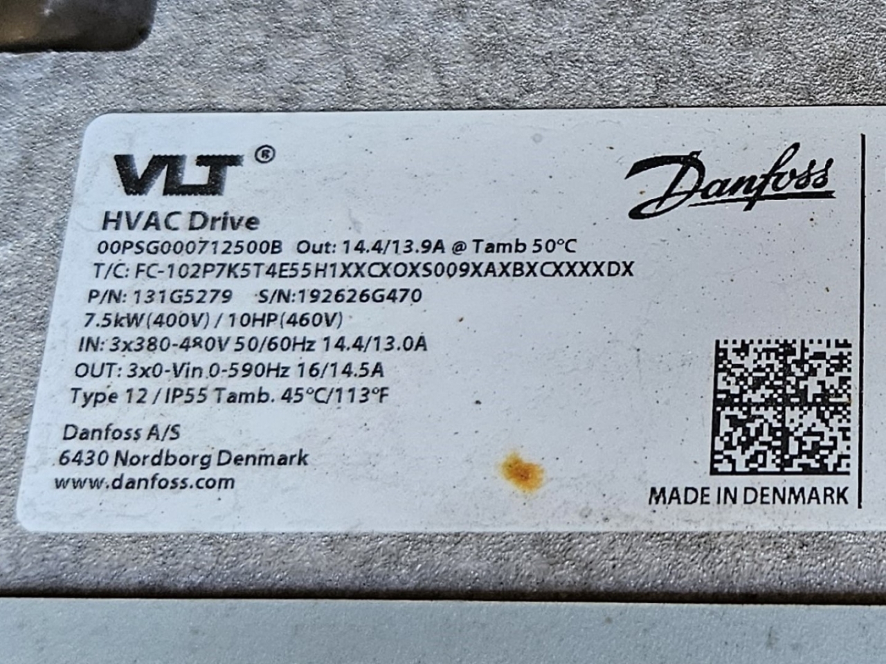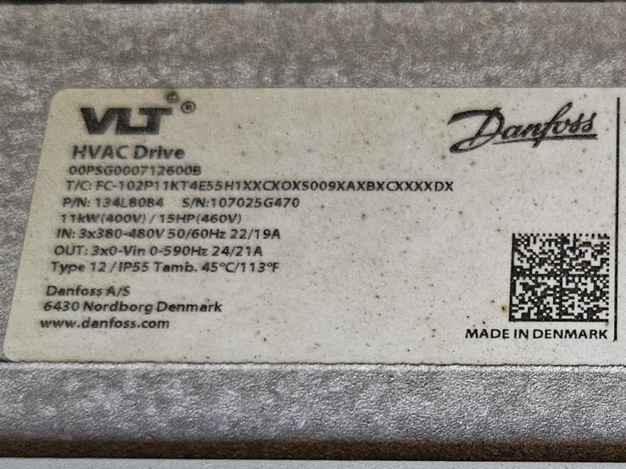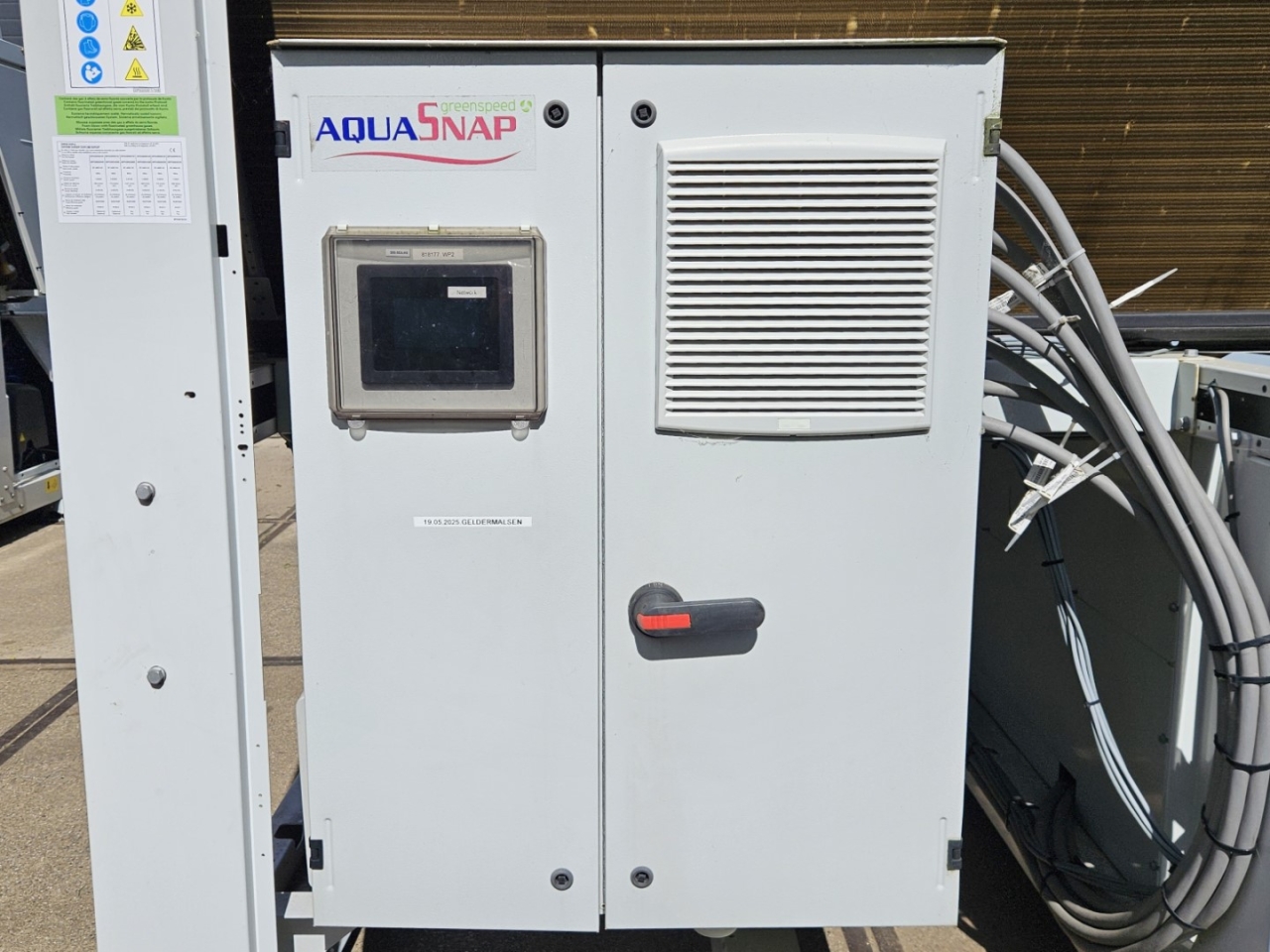 Used Carrier 30 RQP 520 air-cooled chiller / heat pump on R410A built in 2020. Complete with 8 Danfoss SH295A4ACE scroll compressors, condenser with 8 fans that produce an airflow of 129.999 m³/h, brazed heat exchanger as evaporator, Lowara water pump, expansion vessel, 1 Danfoss FC-102P7K5T4E55H1 & 2 FC-102P11KT4E55H1 frequency converters and a control cabinet with a SmartView controller.