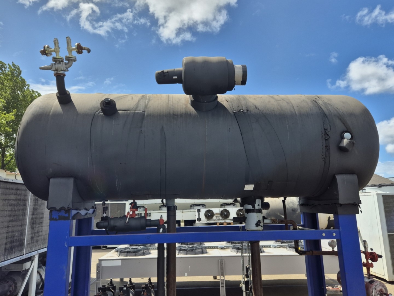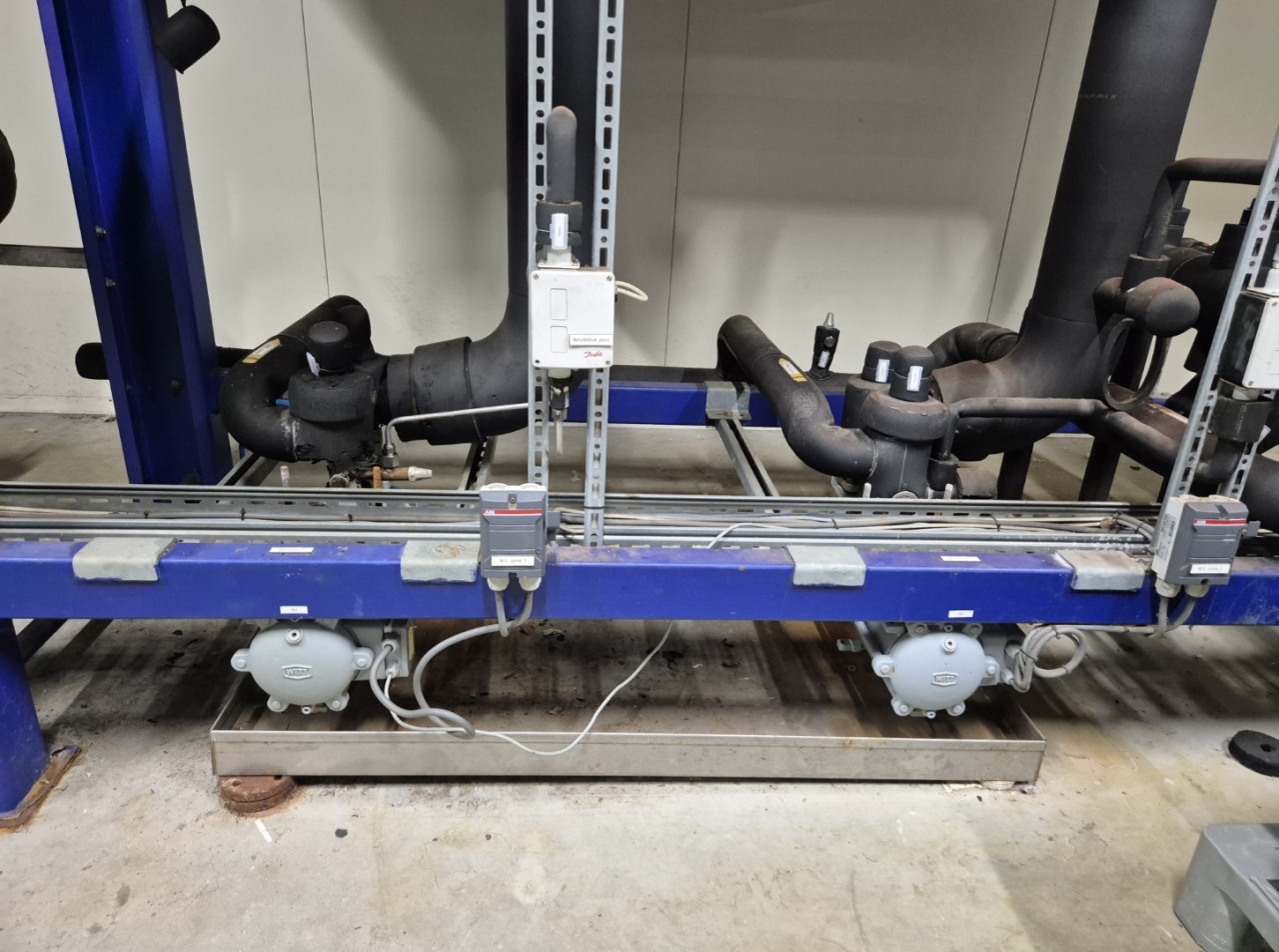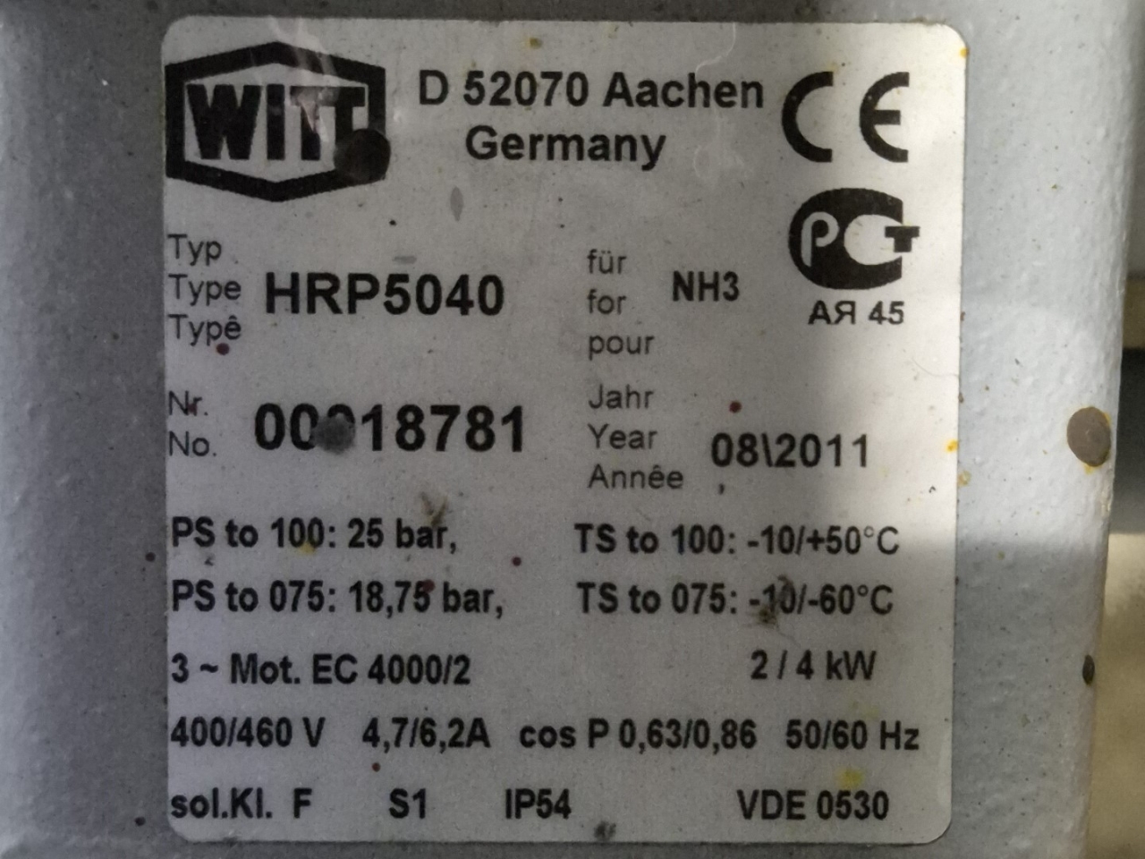 Used Bitzer OSNA 8591-K (x4) open screw compressor rack on R717 (Ammonia). Each compressor complete with a Rotor 23RN250M02 electric motor - 50 Hz - 110 kW - 2960 RPM and pressure and safety switches/gauges. Further the set comes with an oil separator, HS-Cooler KS20-FEP-113 oil cooler, Witt HDB 406 x 1720 receiver with a volume of 210 liter, Witt NDB 1200x4169 separator that has a volume of 4310 liter and 2 Witt HRP 5040 liquid pumps, Witt ECO 3-M/N economizer, NH3 floater and a control cabinet.