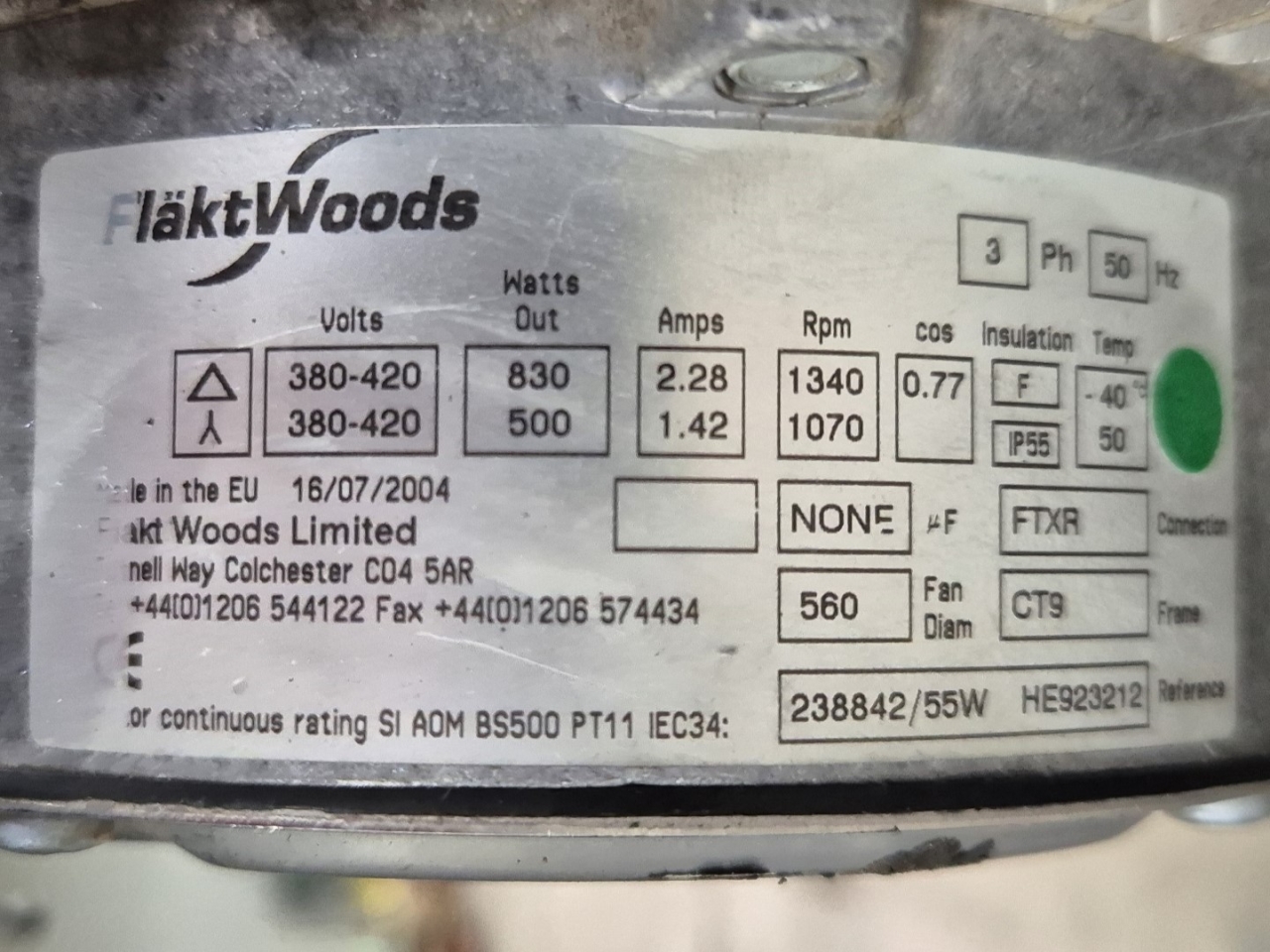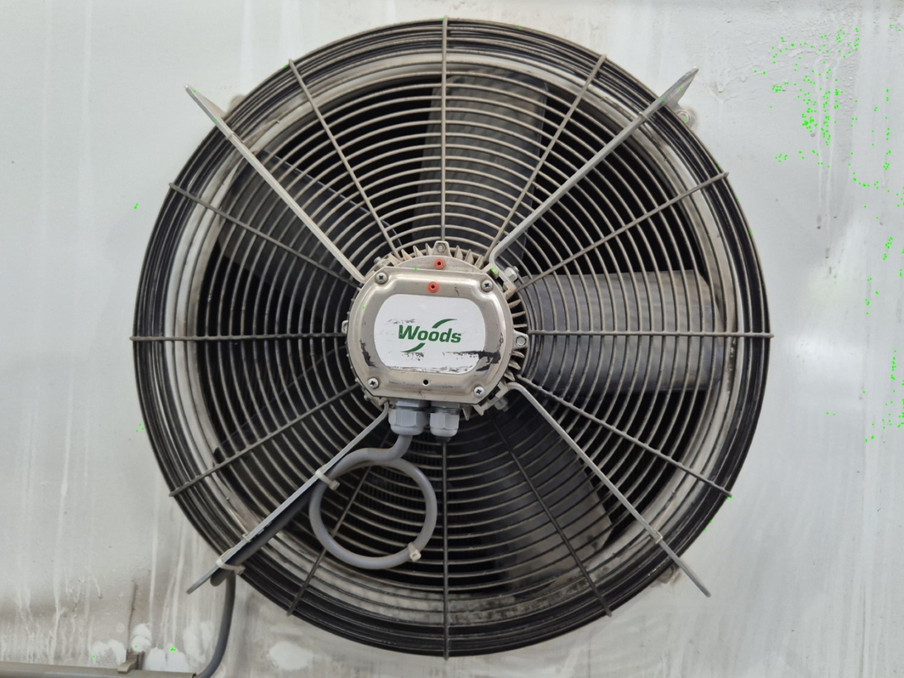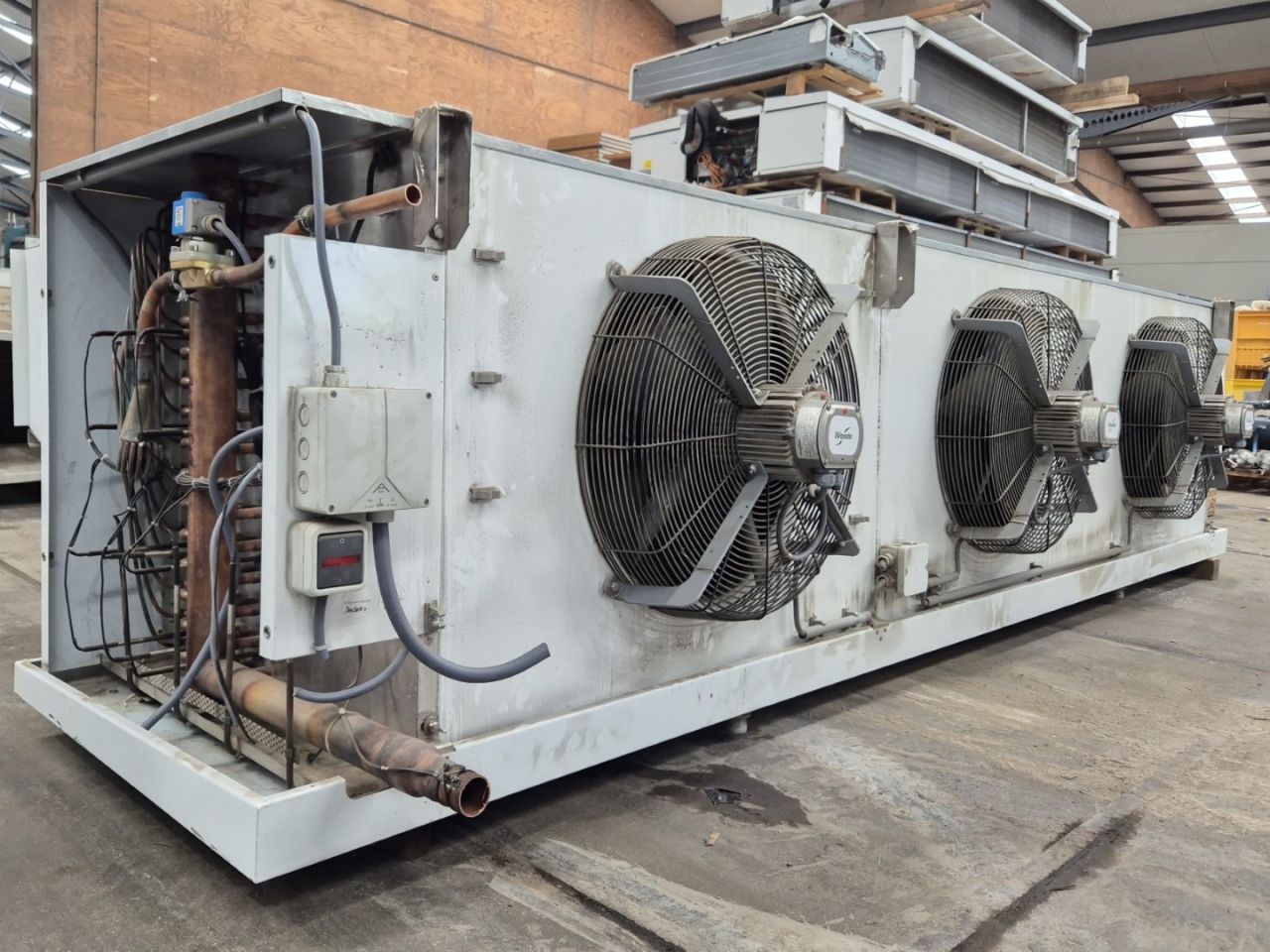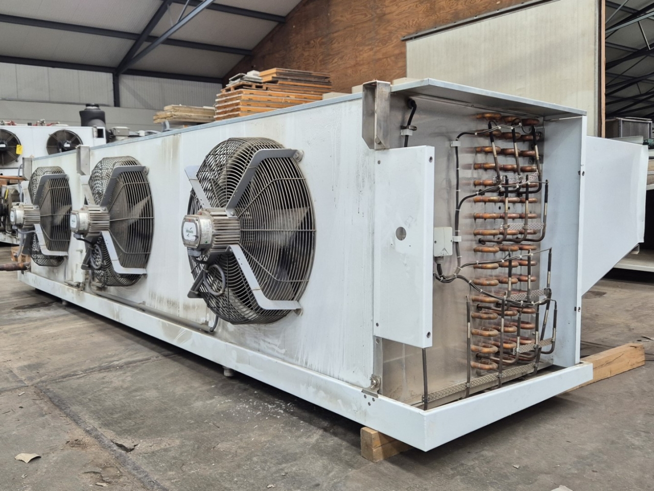 Used Goedhart VCI-B 63567 E Freon evaporator with electric defrost. Complete with 3 Woods fans - 50 Hz - 0,83/0,50 kW - 1340/1070 RPM - diameter 560 mm and a total airflow of 29.728 m³/h.