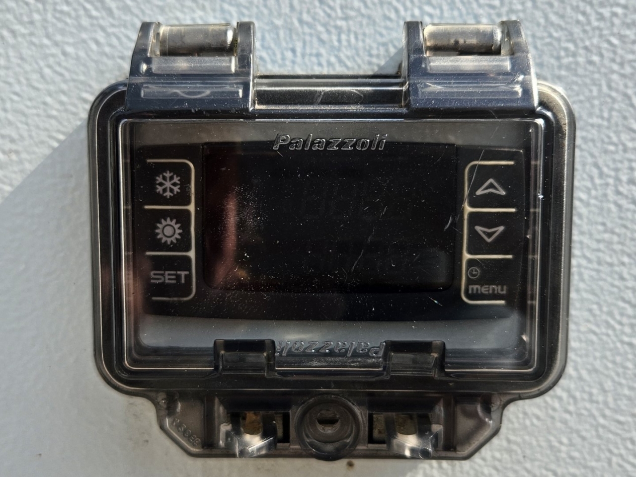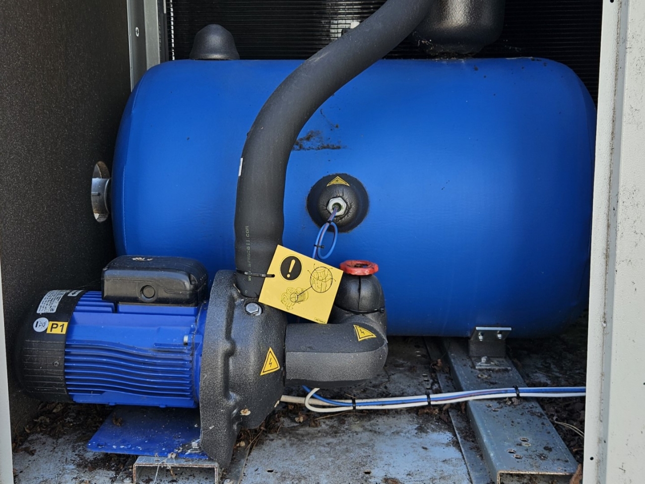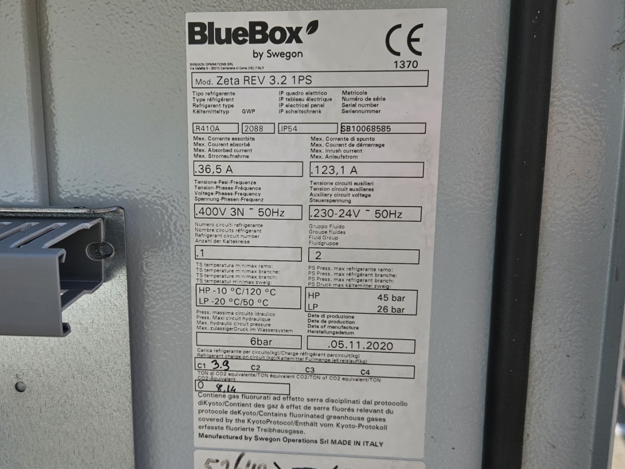 Used BlueBox Zeta REV 3.2 1PS air-cooled chiller on R410A built in 2020. Complete with 2 Copeland ZP91KCE-TFD-422 scroll compressors, condensor with 2 EBM-Papst A6E630-AN01-01 fans - 50 Hz - 0,60 kW - 860 RPM and a total airflow of 16.000 m³/h, plate heat exchanger as evaporator, liquid buffer tank, Lowara CIE120/4/D water pump, expansion vessel, liquid line filter drier and a control box with a control panel.