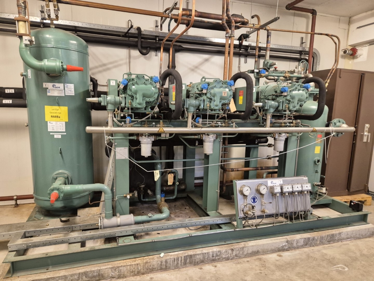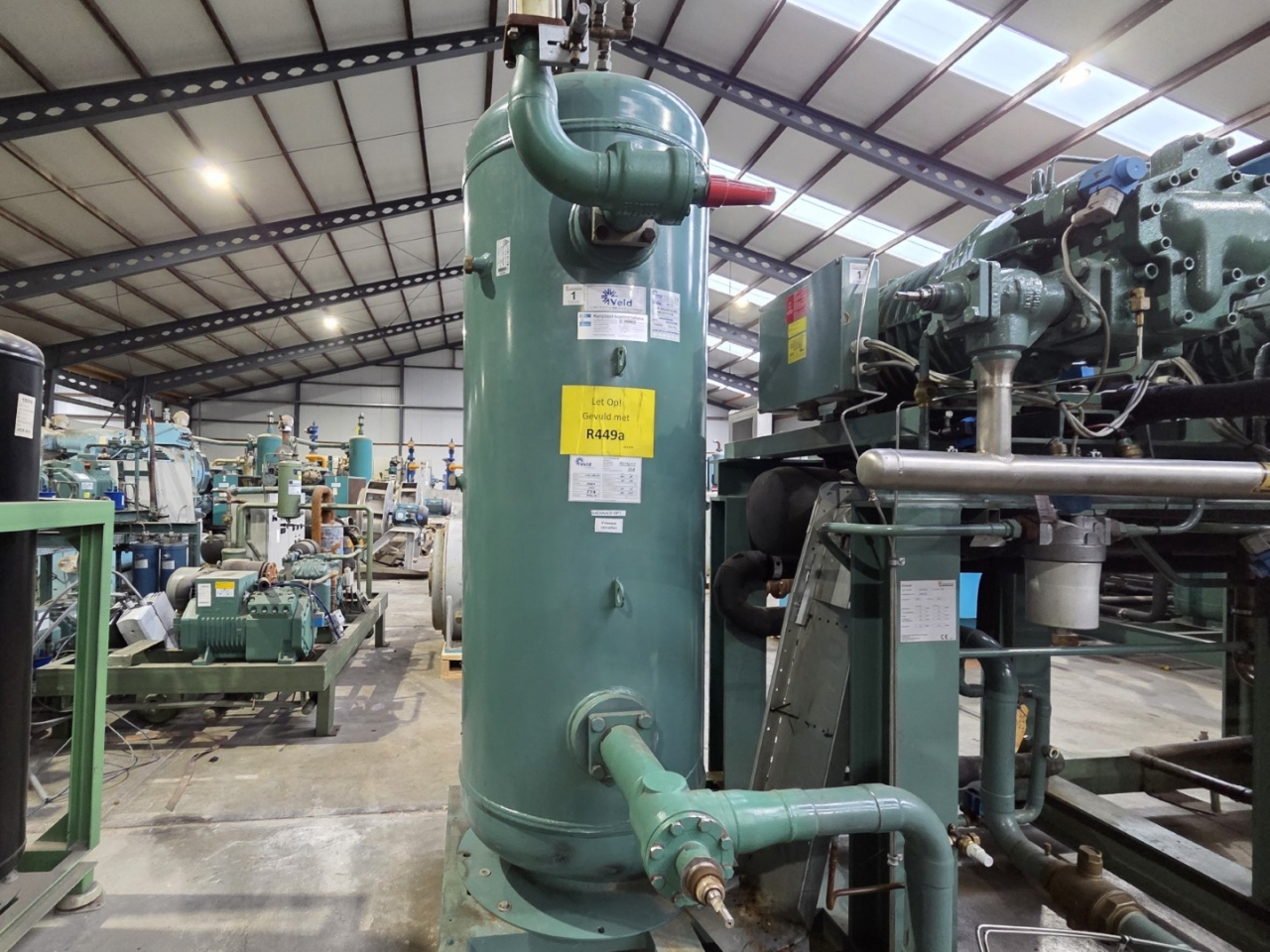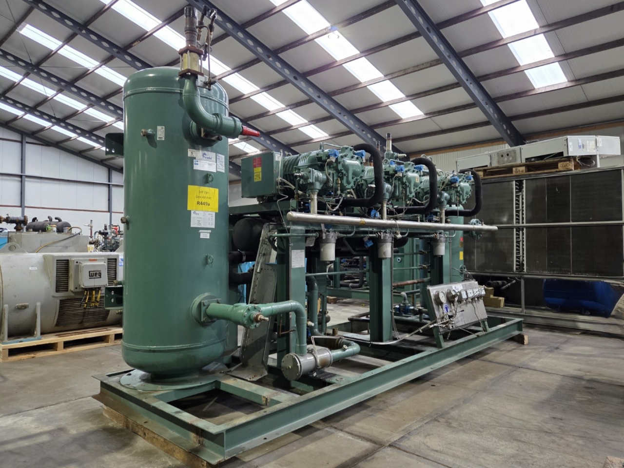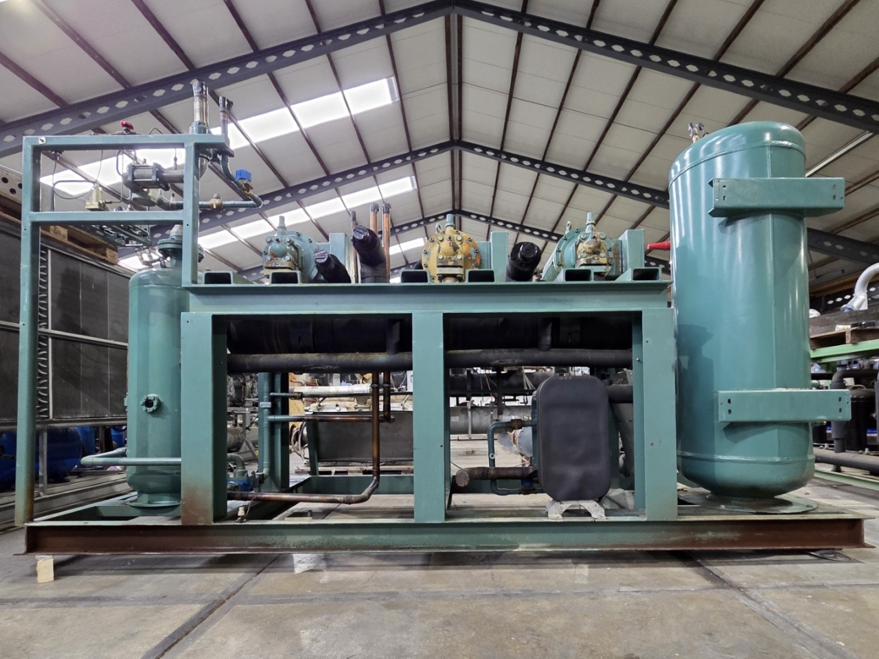 Used Bitzer HSN 7451-60-40P (x3) semi-hermetic screw compressor rack on Freon. Complete with a Hans Güntner RDYG 570 liquid receiver with a volume of 570 liters, Bitzer OA9011 oil separator, brazed heat exchanger as economizer, pressure and safety switches/gauges and a control cabinet. The compressors have a total displacement of 576 m³/h at 50 Hz & 690 m³/h at 60 Hz.