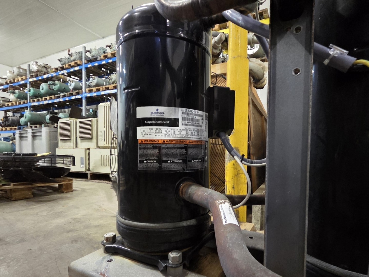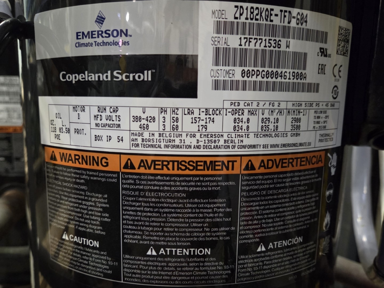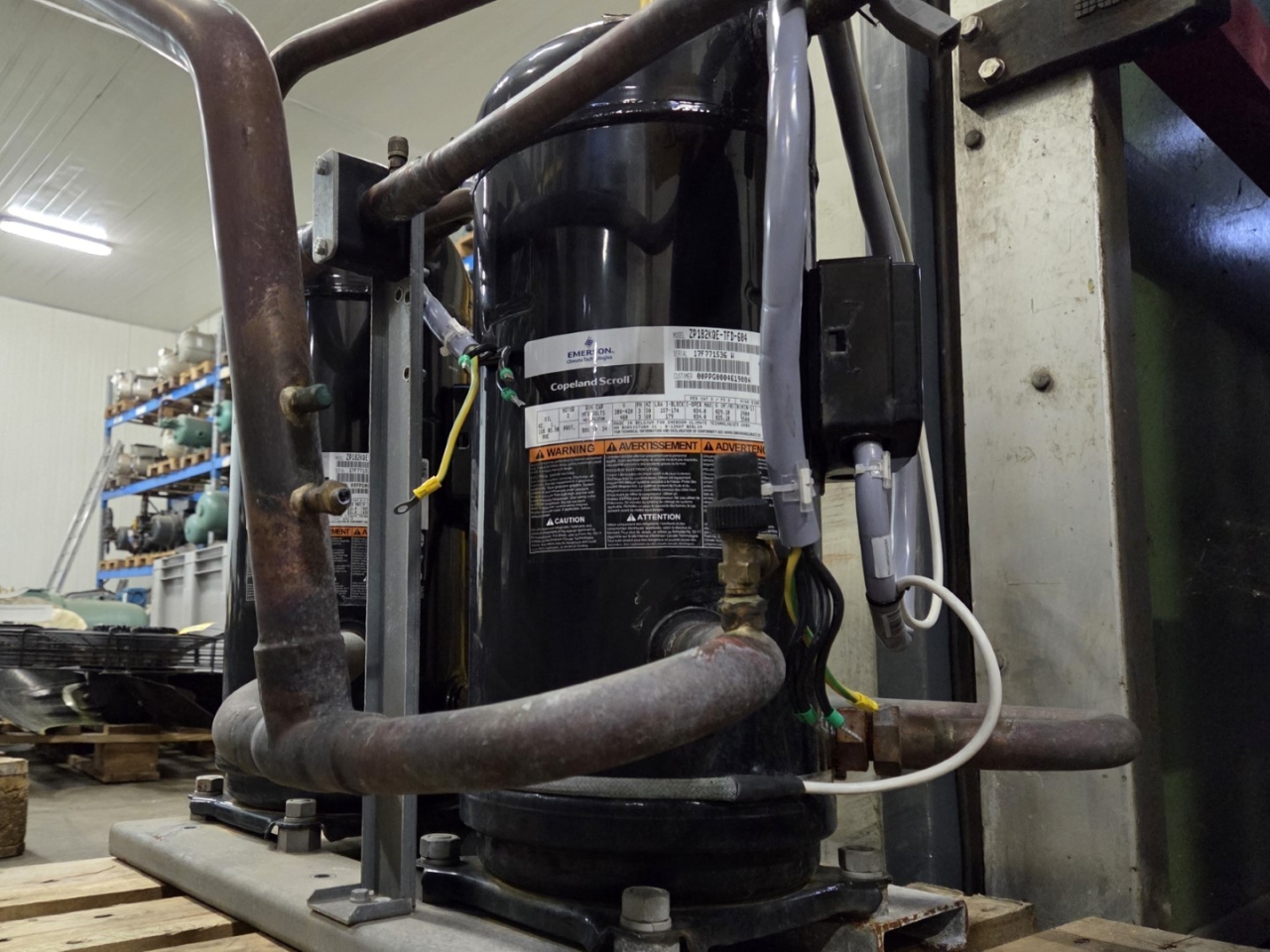 Used Copeland ZP182KQE-TFD-604 scroll compressor on Freon. The compressor has a displacement of 29,1 m³/h at 50 Hz and 35,1 m³/h at 60 Hz.