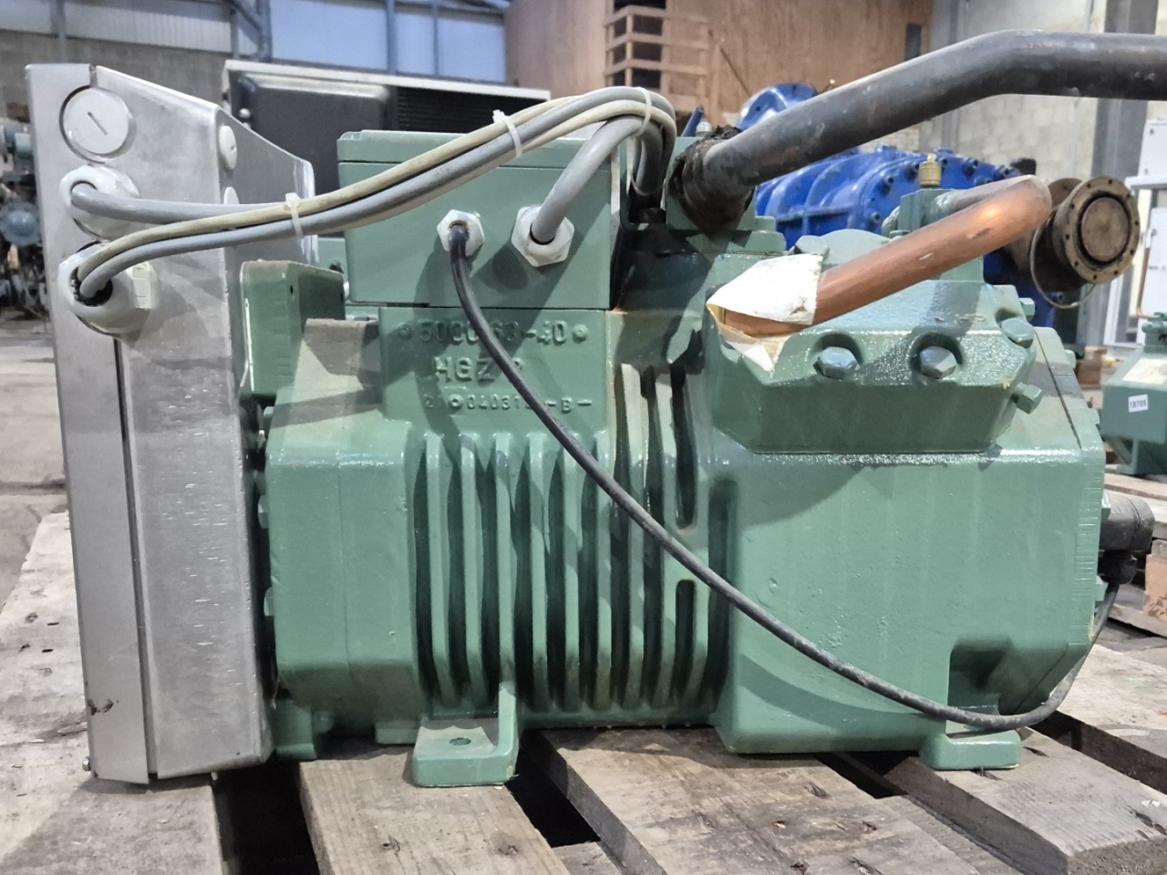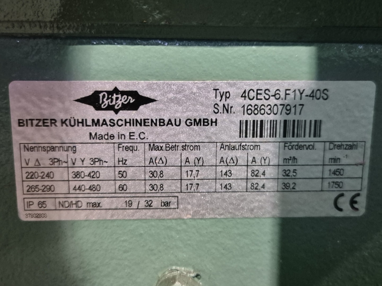 Used Bitzer 4CES-6.F1Y-40S varispeed semi-hermetic reciprocating compressor on Freon with a sight glass. The compressor has a displacement of 32,5 m³/h at 50 Hz & 39,2 m³/h at 60 Hz.