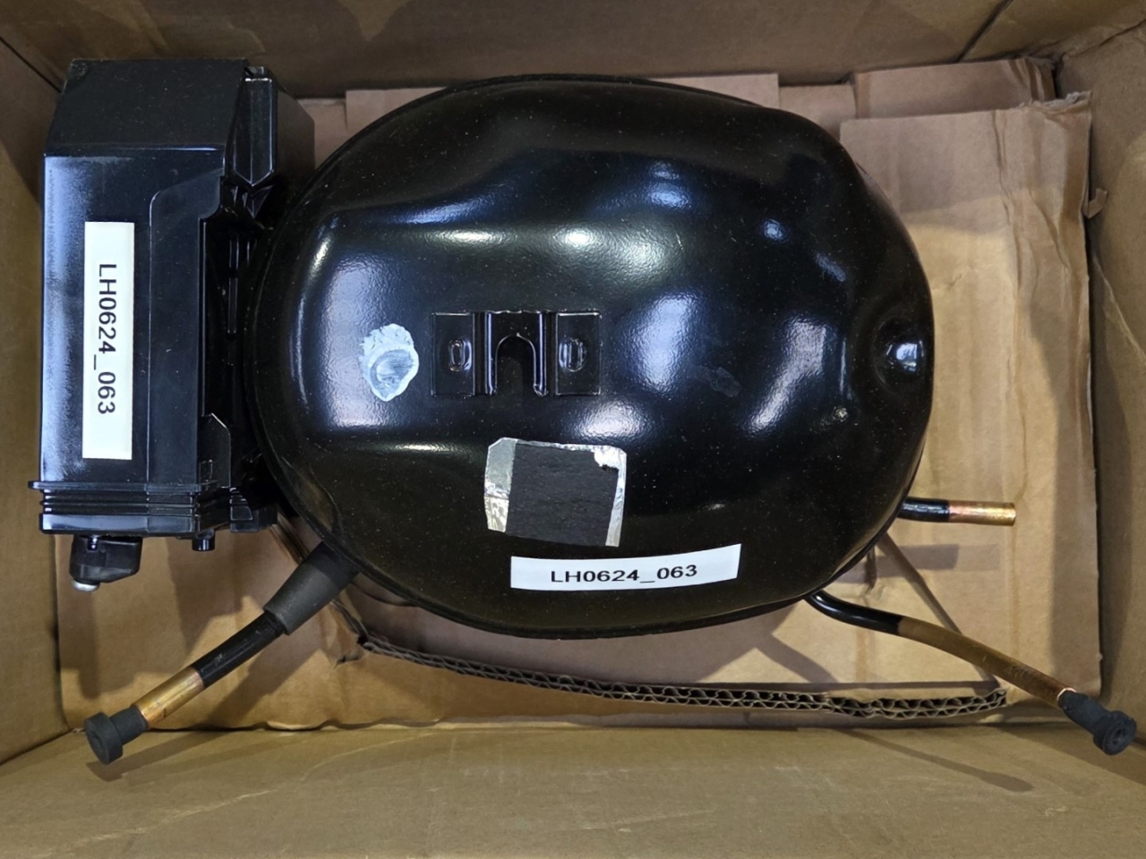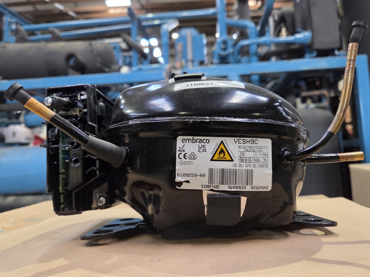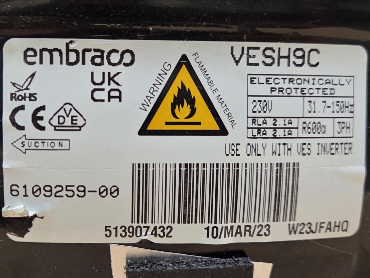 New in the box Embraco / Nidec VESH9C hermetic reciprocating compressor on R600a (Isobutane) for refrigerator and freezer.