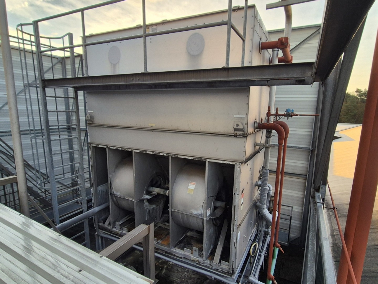 Used Baltimore VXC S 350 evaporative condenser on NH3 (Ammonia). Complete with 2 centrifugal fans that produce an airflow of 94.230 m³/h.