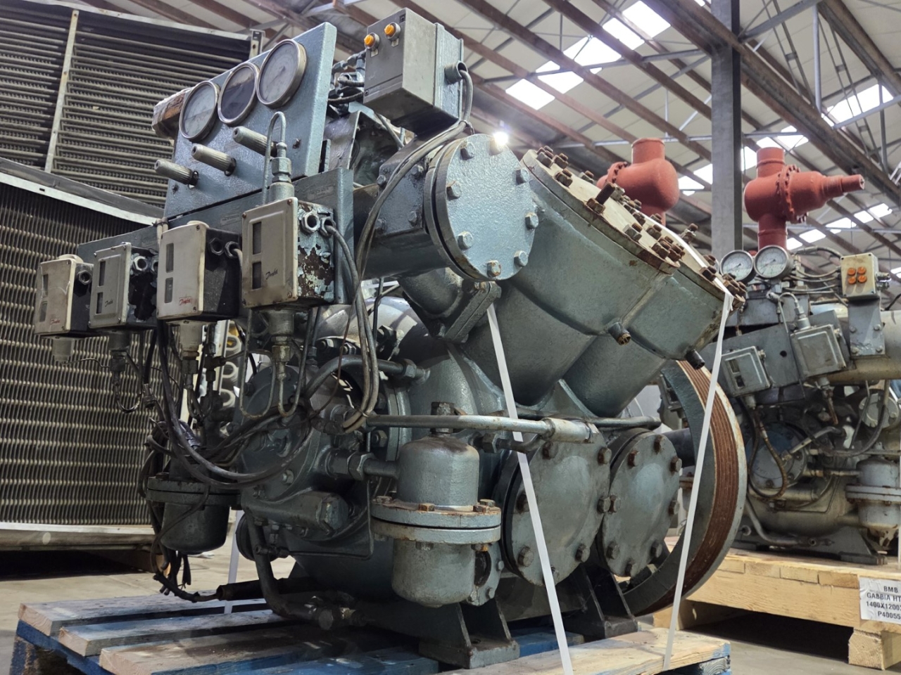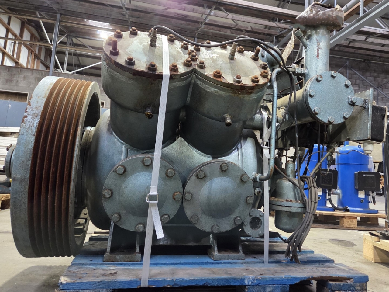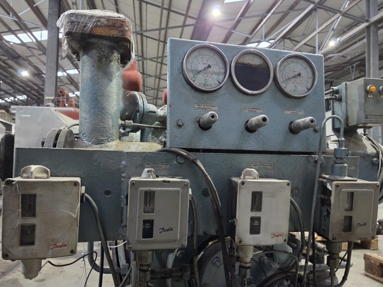 Used Grasso RC 411 reciprocating compressor on Freon with pressure and safety switches/gauges and a sight glass. The compressor has a displacement of 532 m³/h at 1000 RPM.