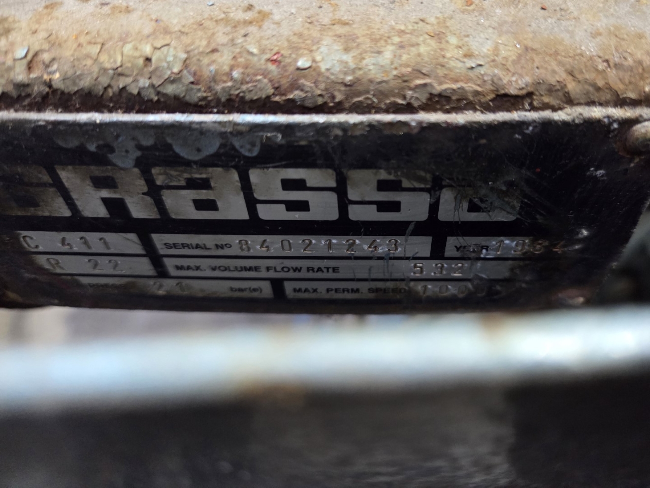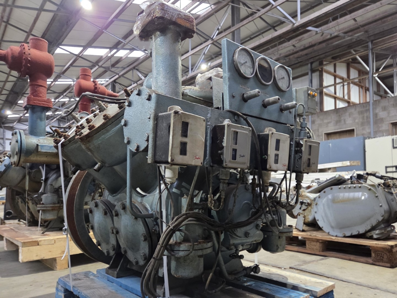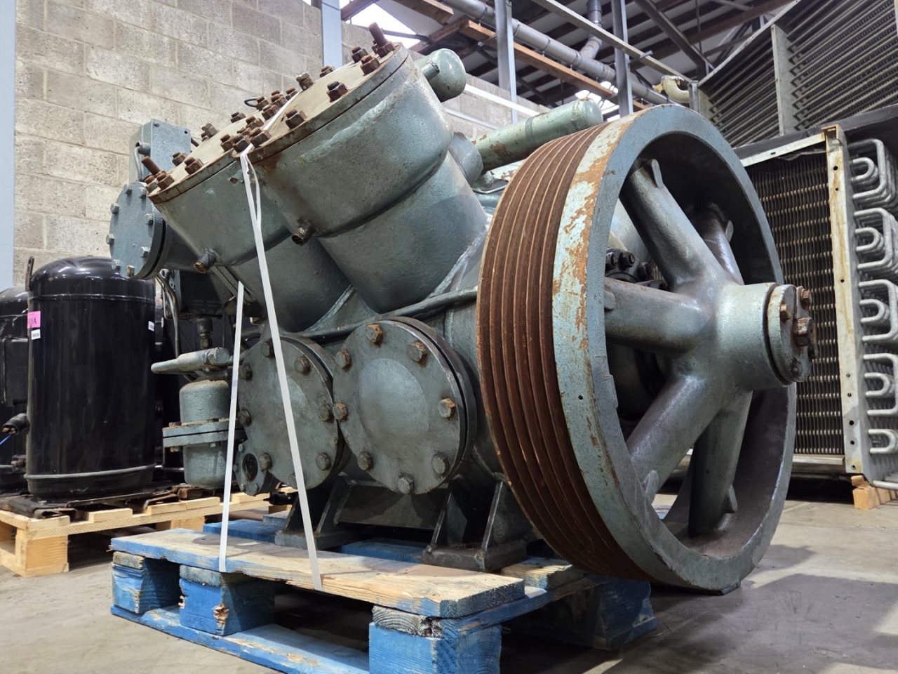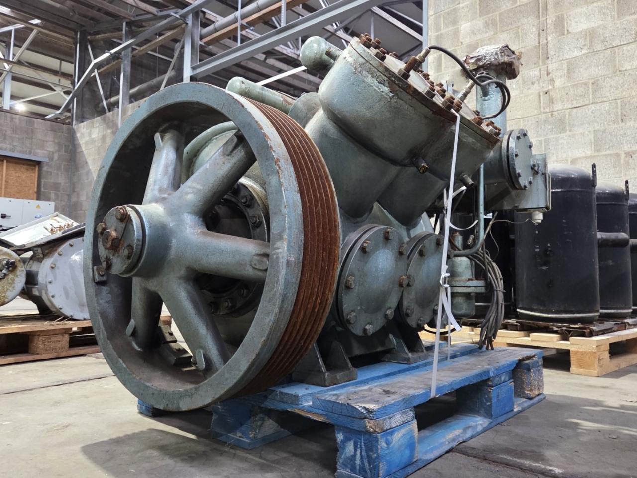 Used Grasso RC 411 reciprocating compressor on Freon with pressure and safety switches/gauges and a sight glass. The compressor has a displacement of 532 m³/h at 1000 RPM.