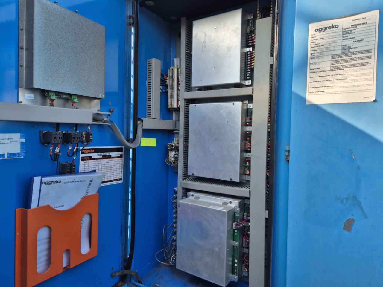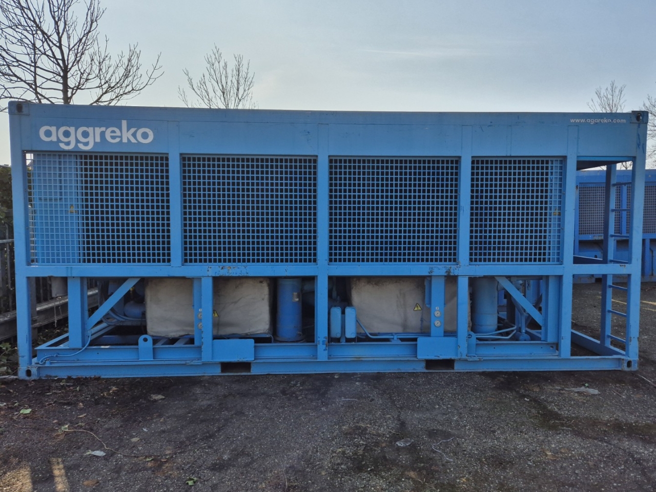 Used Aggreko WCC 750 MK3 / Trane RTAD 180 air-cooled chiller on R134A. Complete with 1x Trane CHHP0N2TKE0N134A & 1x CHHP0N2TKG0N134A semi-hermetic screw compressors, condenser with 10 fans - 50 Hz - 1,25/0,7 kW - 930/750 RPM - diameter 762 mm producing a total airflow of 169.488 m³/h, shell and tube evaporator with a minimum flow of 11,6 l/s and a maximum flow of 38 l/s and a control cabinet with frequency drives and a Trane adaptive controller.