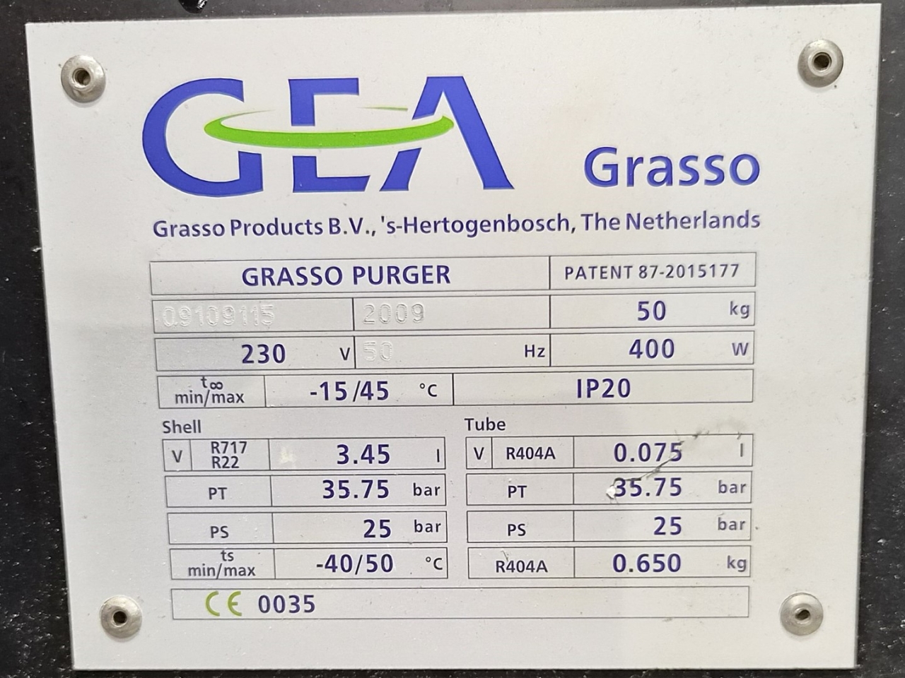 Used GEA Grasso Purger on R717/Freon with 400 W of power. Dimensions: 340x900x500 mm (LxWxH).